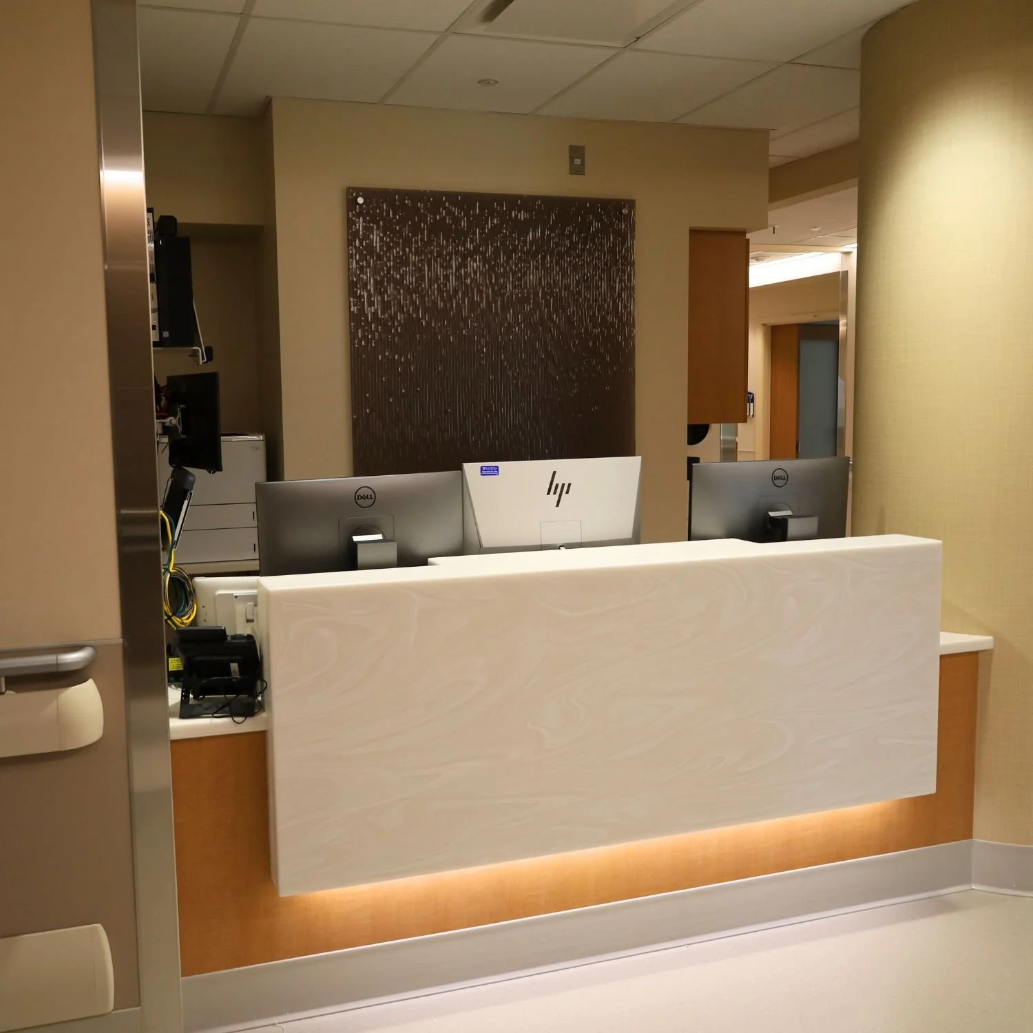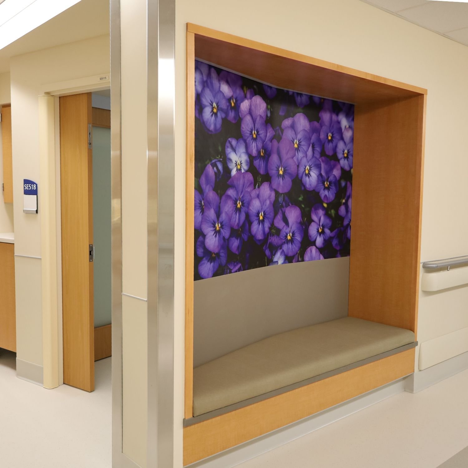 This large hospital addition features patient rooms, custom desks, headwalls, benches, wall paneling, window sills, cabinets, and counters.