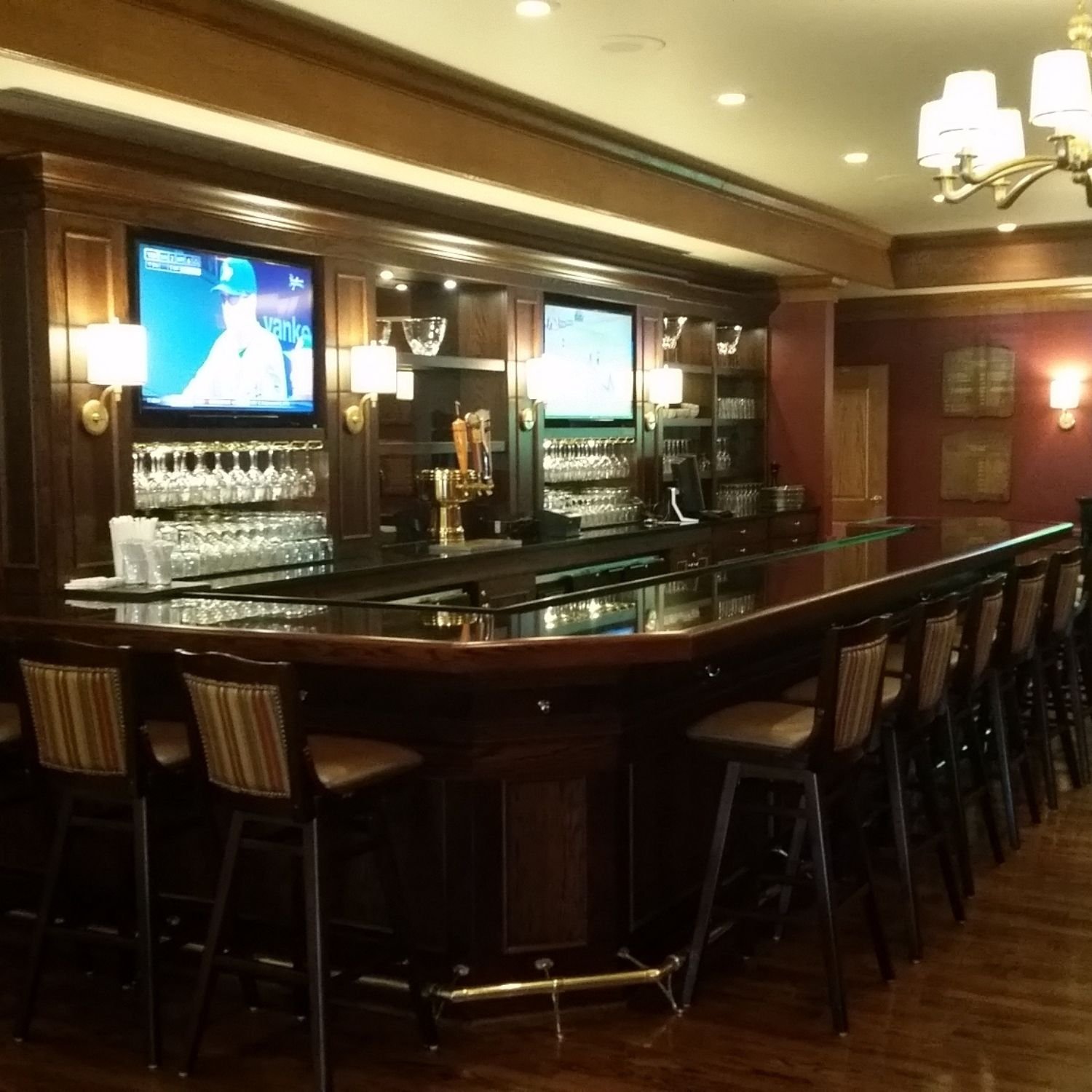 Private club featuring elaborate wood paneling, wood trim detailing, bar, upholstered benches, cabinets and counters.