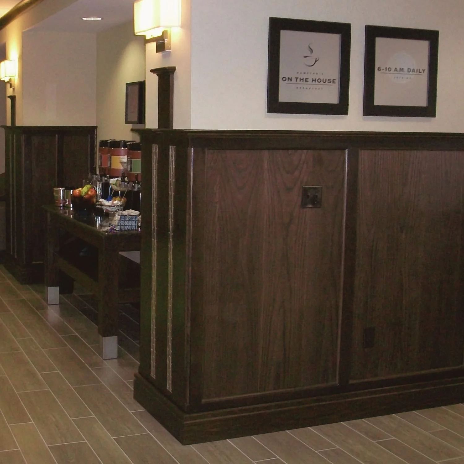 This is a hotel featuring a front desk, wood trim, cabinets and counters.